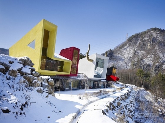 我們可以肯定的說這個短角旅館將會在人們中間產生巨大的爭議,要么非常喜歡,要么極度厭惡,而這恰恰就是建筑設計所Moon Hoon所希望看到的。這個旅館位于旌善郡的郊外,它包含六個演奏室,是提供給搖滾樂隊的吉他手使用的。有藝術色彩,好玩,郊外,這些元素都展現了這個建筑的藝術范兒的風格。對于韓國的都市市民來說大家都渴望能夠在退休后逃離千篇一律的城市生活,而體驗一種像歐洲鄉村風味的感覺。因此客戶便委托Moon Hoon設計所來設計這樣一個地方,也正是客戶的這樣的特殊的需求才會有我們看到的那個獨特的外觀。這里的每個房間都有各自的主題,包括韓式烤肉,油畫,甚至傳統的韓國屋子里的吊床,它們共同組成了一個動態的多樣的建筑風格。