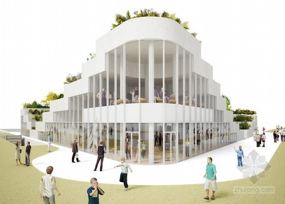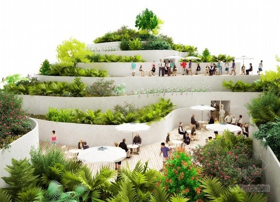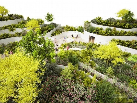 由荷蘭NL architects建筑事務所設計的“三亞超級市場”將于2014年完工,這個項目位于中國海南省三亞,建筑師在一個抬升的梯田式花園下方擴建了一個地下公共空間。建筑位于三亞度假區內,將包括三座21層高的住宅大樓,并帶有半開放庭院。住宅建筑之間是大量的景觀綠化和園林建筑,為居住者創造了一個集社交、商業和娛樂活動為一體的交互式生活環境。三角形的超市建筑將包含許多公共戶外空間,它與水平延伸的傳統超市不同,有一部分空間在地下,與每座住宅樓相連,廢物排出和商品運輸等后勤功能都隱藏在這個地下空間中,不會出現在地上。屋頂由一系列凸出的臺階組成,上面種植了許多綠色植物,巨大的玻璃窗門墻、小零售商鋪掩映其中,綠植還標示了建筑的入口。在周圍的住宅塔樓間,這個超市建筑成為一個抬升的綠色花園,同時將一系列功能空間和通往超市核心的交通道路暴露在外。
