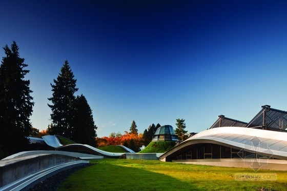 該項(xiàng)目是由Perkins+Will建筑事務(wù)所設(shè)計(jì)的VanDusen植物園游客中心,項(xiàng)目需要滿足最苛刻的可持續(xù)要求,形式上和功能上它都要包含生態(tài)及社會意識的設(shè)計(jì)。建筑其實(shí)就是一個(gè)起伏的景觀,包含交織的從地上升起到屋頂?shù)氖覂?nèi)室外空間,這些結(jié)構(gòu)為種植多種植物提供巨大空間,建筑與景觀在此交融。建筑同時(shí)包含多種被動及主動的能源系統(tǒng),它們重新利用場地的可回收資源和建筑自身排放的垃圾。