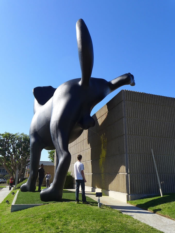 藝術(shù)家Richard Jackson近日在OCMA(Orange County Museum of Art,Newport Beach,California)的建筑物外做了一只撒尿的黑色拉布拉多獵犬(black labrador)雕塑。