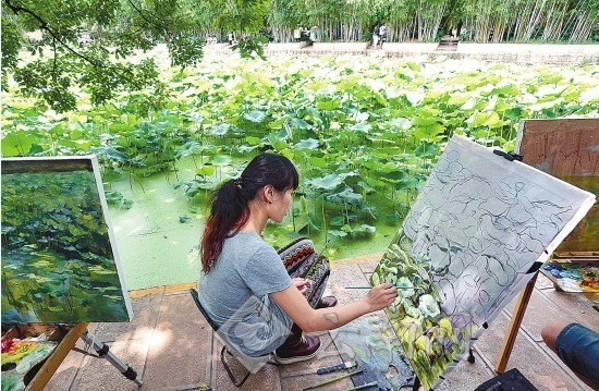 美麗荷花引來學生作畫