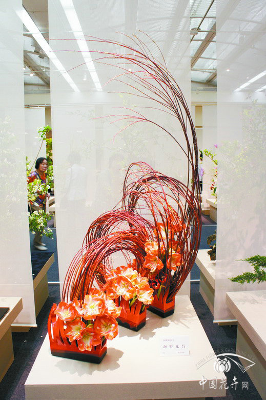 除直線以外,曲線、圓形以及由此發展出來的螺旋形作品也屢見不鮮,比如“媽咪花藝設計學校展”中的作品,用土和石子粘貼而成,由兩個螺旋形纏繞成一個大S形,這類作品往往是順應需要裝飾的商品或建筑物的形狀,以懸垂形式展示。“日本插花藝術展”中國風華道會的一個作品(圖2)也很別致,作者海野光昌只用了兩種同色花材紅瑞木和朱頂紅,就組成了兩個不規則的圓形、一個半圓形和一種曲線,又精心地加上曲線的躍躍欲試感,以免作品流于平庸。此作品極其到位地運用了彎曲樹枝的技巧,將大把的樹枝彎曲成同樣的形狀,同時又能在成把的形狀中凸現一根根樹枝的線條美。