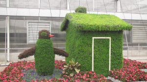 昨天,記者來到楊柳青的園林苗圃,除了綠色的房子外,還看到了各式各樣的立體景觀,有栩栩如生的大葫蘆、一躍而起的海豚、展翅翱翔的飛機、翩翩起舞的蝴蝶……每一個都十分精致,工作人員告訴記者這些叫“草雕”,都是根據生活中常見的東西做成的。“你看這飛機,機身、機翼……每個部位都是根據實物縮小比例而成。”