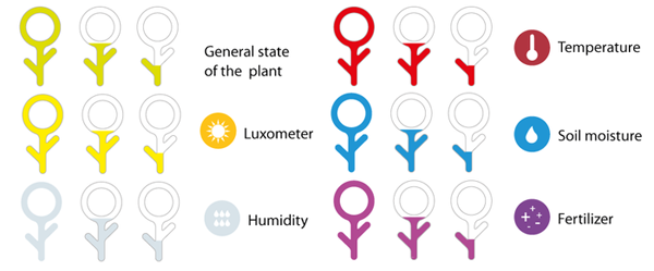 Fliwer會通過不同的LED色彩來提示植物的關鍵參數狀況,其中黃色代表光亮度、灰色代表濕度、紅色代表溫度、藍色代表水分、紫色代表養(yǎng)分。如圖所示,當某種參數指標下降的時候,就意味著用戶需要進行相關的處理。