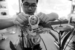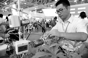 日前,2013中國安徽(合肥)農業產業化交易會在安徽國際會展中心開幕。一批服務于現代農業智能化、信息化和現代化建設的高科技產品亮相農交會。圖為安徽朗坤物聯網有限公司工作人員為植物秋葵做“心電圖”,通過監測植物生理特征的本體感知監測儀,對植物葉片溫度、莖流量、果實大小、莖稈粗細、蒸騰量、光合作用等數據進行精準采集。