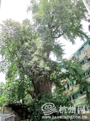 老浙大橫路2-3號,兩幢樓房之間,有一棵千年銀杏樹,雄偉蒼勁,遮天蔽日。這也是杭城鬧市內(nèi)最老的一株銀杏。