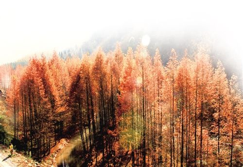 而在石柱眾多的美景中,石柱的彩林、火棘、湖光山色最受游客喜愛,特別是彩林。在炫麗的夕陽下,紅的水杉、黃的銀杏、綠的楠木……五顏六色的彩葉疊滿了山巒,層次分明,色澤和諧,猶如一幅色彩斑斕的油畫。在這幅美景中,最迷人的當屬水杉。水杉葉色彩火紅透亮,經(jīng)山風一吹,便鋪天蓋地、紛紛揚揚地撒落一地,讓人沉醉。