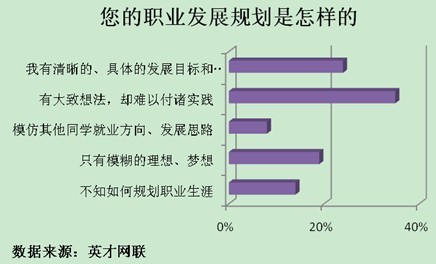 據“您的職業發展規劃是怎樣的”一項調查結果顯示,不知如何規劃職業生涯的求職者占14%,只有模糊的理想、夢想的求職者占19%,模仿其他同學的就業方向、發展思路的求職者占8%,有大致想法卻難以付諸實踐的求職者占35%,明確表示自己有清晰、具體的發展目標和計劃且正在實施中的求職者僅占24%。