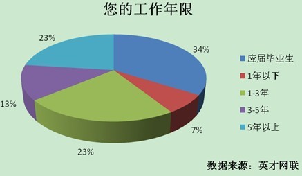 參與本次調查的應屆畢業生及不足一年經驗的人數共占41%,有一至三年工作經驗的人數占23%,有三至五年工作經驗者占13%,有五年以上工作經驗的人數占23%,由此可見,目前,工作經驗并不豐富的求職者占據大多數。