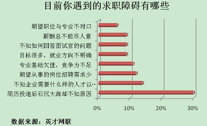 本次英才網聯調查結果顯示,在眾多求職障礙中,簡歷投遞后石沉大海卻不知原因者占30%,不知企業需要什么樣的人才及如何展示自己者占14%,期望從事的崗位招聘需求少占12%,專業基礎欠佳,競爭力不足者占11%,目標很多就業方向不明確、不知如何回答面試官問題、薪酬不盡人意者各占9%,另有6%的求職者期望的職位與專業不對口。