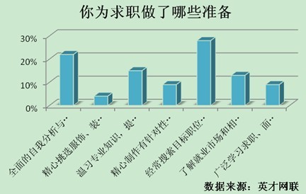 據“你為求職做了哪些準備”一項調查結果顯示,全面自我分析與評價者占22%,經常搜索目標職位并投遞簡歷者占28%,溫習專業專業知識,提高必備技能者占15%,了解就業市場和企業需求者占13%,精心制作有針對性簡歷者占9%,廣泛學習求職、面試技巧者占9%,精心挑選服飾、裝扮自己者占4%。
