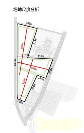 場地形狀不規則,南北方向較長,約1304米,東西方向相對較窄,南端最窄處僅有132米,場地三個長向空間分別為900米,770米,570米。