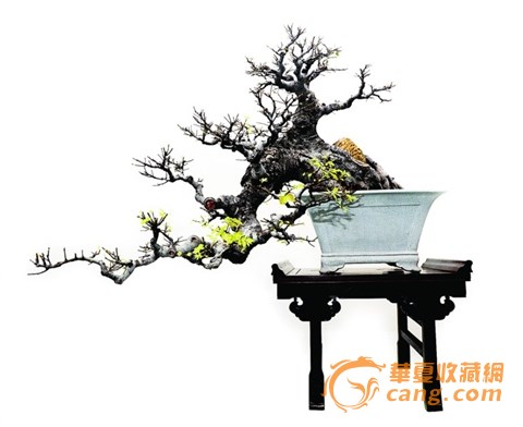 長長的柏樹樁干,自盆沿懸垂彎曲而下,似幾近干涸的瘦瀑布,枝葉溜溜成團(tuán),越往下葉團(tuán)兒越小;黃楊樹樁的那些云片,圓似蓋,一朵朵呈俯視態(tài),葉綠綠而疏密有致,枝丫丫卻扭曲蛇盤;幾十年乃至上百年的虬干老枝,培植于古盆之中,高不盈尺,或懸或垂、或俯或仰,猶同一位位垂垂老矣的老人……