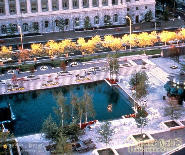 水池、綠地、硬質廣場的疊加形成了公園廣場(Park Plaza)這一新的設計概念,在他的廣場設計作品中,隨處可見此種處理方式的運用,而最具典型性的代表則是賓西法尼亞大街上的珀欣公園。