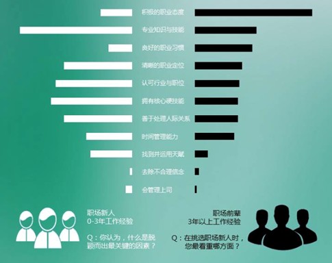 6月份,中國職業生涯發展協會(CCDA)的生涯研究中心做了一個有趣的調查。他們調查了500多個在職人士,問他們一個問題:“為了讓你在職場新人中脫穎而出,你覺得下面哪三項最為關鍵?”,然后這些人需要在如“時間管理”“人際溝通”“積極的職業態度”“找到自己的天賦”等清單中,選擇最重要的幾項。