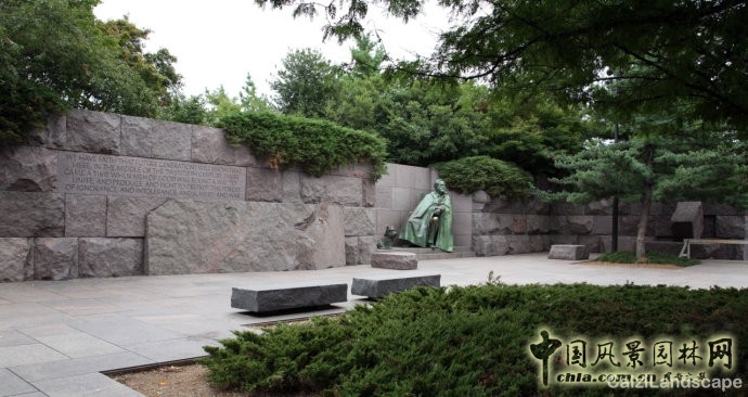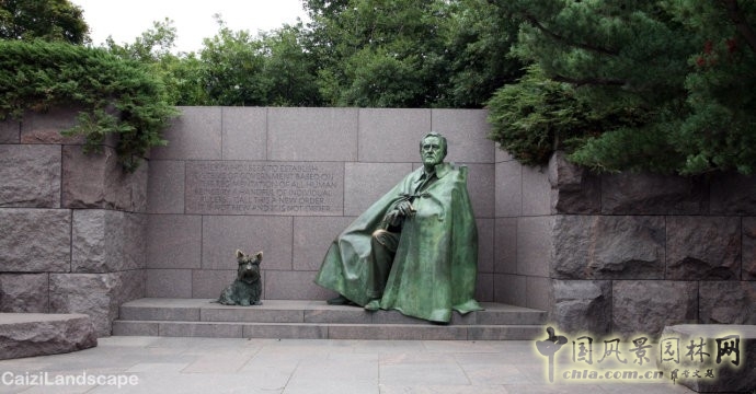 全區公園粗面與光面的巖石上,不時刻有一段段的文字,于公園出口。遠眺杰佛遜的軸線步道旁,墻面的終點所刻就是最令人向往的四項自由一一言論、信仰、免于匱乏、免于恐懼的自由。