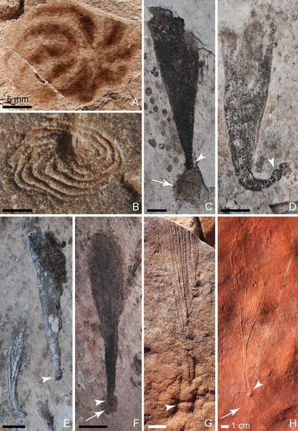 圖1:其中圖1A來自廟河生物群,圖1B、G-H來自埃迪卡拉生物群,圖1C-F來自藍田生物群