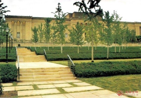 由于展覽館與室外地面一定的高差,凱利借鑒了意大利臺地園總設計法,就勢設計了五級臺地,以此作為室內外環(huán)境的過渡空間。每級臺地上都種植了五棵銀杏樹,作為展覽館建筑南立面的“綠墻”,它們有著相同的節(jié)奏,人們穿行其中時就好像在展覽館中的畫廊一樣。