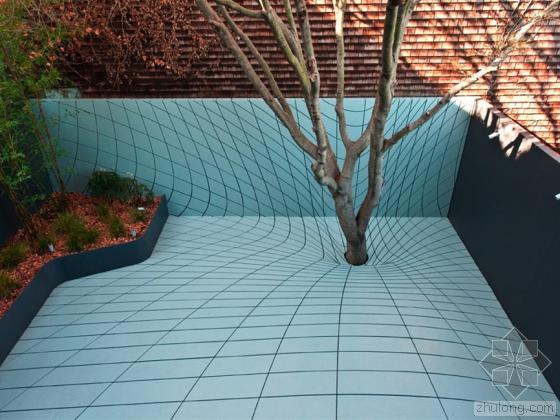 此次的設(shè)計作品名為”Deformscape”,座落在舊金山城市街區(qū)的一棟私人住宅。這座空間有限的室外雕塑花園中只有一棵書,設(shè)計師ThomasFaulders將其設(shè)計成引力模式下的作品,設(shè)計上使用三維思維創(chuàng)作,利用三維投影方式,造成2D平面上歪曲線網(wǎng)投影。這個作品就是在平面上通過線的走向趨勢給我們在三維上造成一種下陷的錯覺。