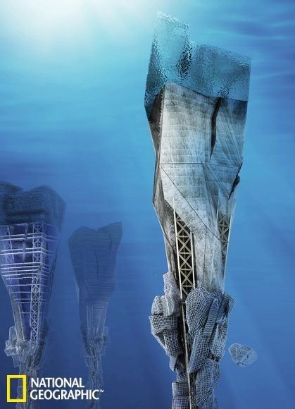 對于太平洋垃圾帶的另一種解決方案是反其道而行之,在水下建造“垃圾填埋場”,比如這款由一個塞爾維亞小組給出的“海洋高樓”(Oceanscraper)設計方案。這座塔的底部會被用來收集垃圾并送至其核心進行處理。這座海底塔形建筑的上方將可以支持建造具備自持能力的居住區。為了保持其上的居住區在發展過程中不至于下沉,這款塔形建筑將可以吸收或釋放海水來平衡由于收集大量垃圾而導致的自身重量變化。設計師表示,那些多余的塑料垃圾將被轉變為電能并儲備在蓄電池里。