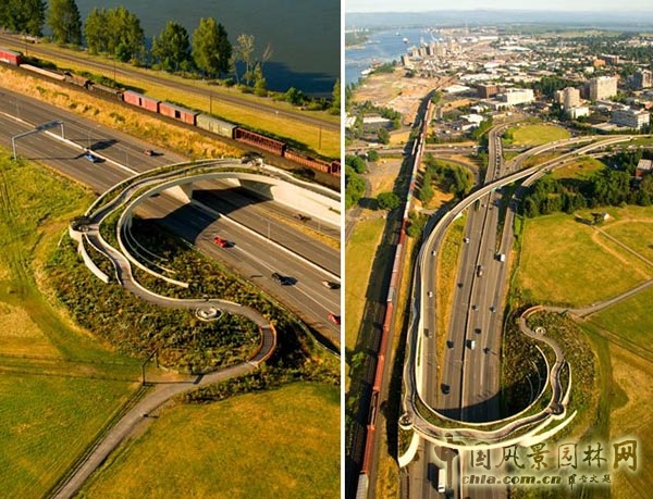一個簡潔、優雅的弧線跨越了14號公路,連接了歷史悠久的溫哥華堡和風光美麗的哥倫比亞河濱,在高地大草原到哥倫比亞河濱之間,保持了自然景觀的連續性。天橋設計簡單,平滑的曲線配以綠植,卻蘊含著濃郁的歷史氣息??吹剿?,仿佛眼前是劉易斯和克拉克的探險隊員,正在昂首挺胸的跨越哥倫比亞河濱,向著太平洋進發。
