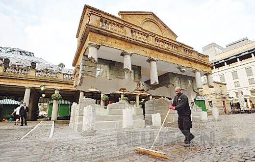 據(jù)英國《每日郵報(bào)》報(bào)道,倫敦知名景點(diǎn)、有184年歷史的科芬園市場,最近邀請藝術(shù)家設(shè)計(jì)一個(gè)以市場建筑為雛形的藝術(shù)品,建筑體中間的梁柱與墻面斷裂,遠(yuǎn)看有飄浮的效果,吸引大批民眾圍觀拍照。