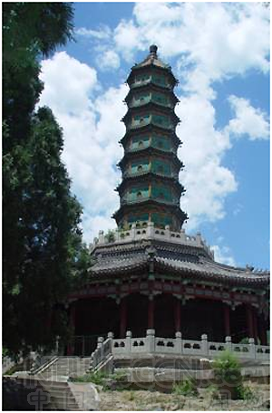 琉璃塔。這座被英法聯軍燒毀的綠色琉璃塔,其色形俱佳的美感已經成為香山公園的標志性建筑。它建于乾隆四十五年(1780年),是昭廟最后一組建筑,塔高30米,是七層密檐式實心塔,塔基為八角形須彌座,塔身表面有80座琉璃佛龕,檐端銅鈴聲聲,塔下由八面傘形瓦頂建筑承托,內筑石雕拱門,石壁上雕有八尊佛像。