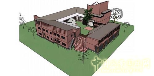 內(nèi)院的設(shè)計親切而安靜,雕塑、水池、以及一些低矮的開花植物,硬景和植物軟景搭配得當(dāng)。在建筑東側(cè)入口處以及西側(cè)的墻面上順著豎桿爬滿了藤蔓植物。除此之外,東側(cè)門廳旁的一塊面積不大的磚石地面,基本以草地覆蓋。對院內(nèi)的營造,給人以加的感覺。