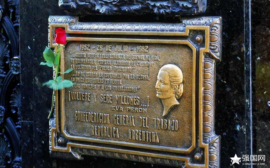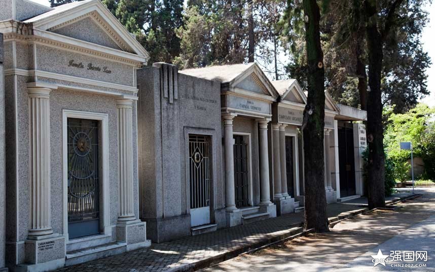 著名的貝隆夫人長(zhǎng)眠于此。媒體稱(chēng)這座公墓是“布宜諾斯艾利斯的縮影”——縱橫的小巷、綠樹(shù)成蔭的廣場(chǎng)、殘破的陵墓、光潔的雕塑目不暇接,就像一座迷宮。雖然朝圣者們?yōu)樨惵》蛉思娭另硜?lái),但獨(dú)立英雄曼努埃爾多雷戈以及Leloirs家族的陵墓卻更讓人印象深刻。
