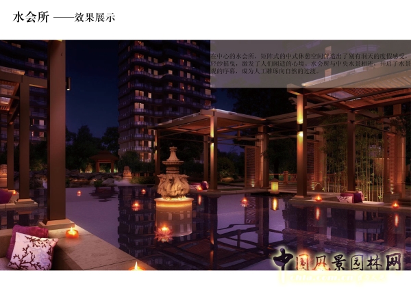 景觀設計運用現代的設計手法和裝飾材料來傳達中式園林的意境。通過中心湖景和游園式景觀布局營造出豐富的空間體驗,構筑自然的山水景園,果嶺般的四時華景。在中心的水會所,矩陣式的中式休憩空間營造出了別有洞天的度假感受,輕紗搖曳,激發了人們閑適的心境。水會所與中央水景相連,開啟了水景觀的序幕,成為人工雕琢向自然的過渡。