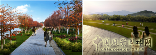 北側(cè)以開闊草坪景觀將流溪河自然資源引入地塊內(nèi),沿河將濱水步道和草坡臺(tái)地相結(jié)合,增強(qiáng)項(xiàng)目親水性,結(jié)合駁岸種植水上植物,豐富沿岸景觀。打造游船碼頭,形成水上串聯(lián)流溪河沿線景點(diǎn)的水上游路。