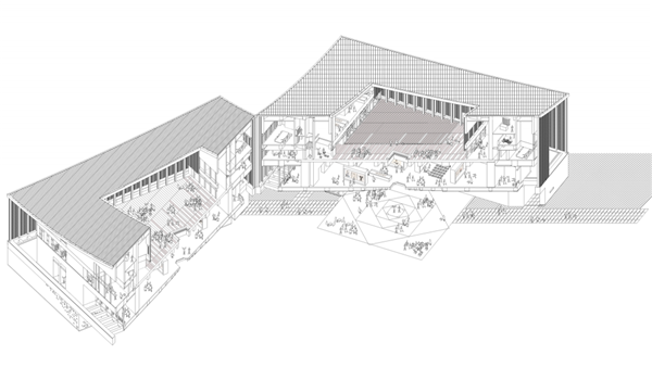 “關系院”首先表現在同時呈現的三種不同的院落形式:建筑底層的“井院”、建筑二層南北穿通的“水院”與“石院”、建筑三層四邊圍合的“合院”。并在此基礎上構架起以井院、水院、石院、合院為主體的疊合的立體院落。“疊合院落“的初衷是期望在受限的場地上化解建筑的維度,將一個完整的大體量化解為三個更局部的小體量,這更便于我們以“身體”的概念對院落進行詮釋。我們得以從類網格的控制體系以及整合全局的習慣性秩序中脫身出來,從局部的略為松散的關系開始游覽。就像看似不相干的三種院子,由于各自的理由被聚集在一起,由于連接方式的不同而呈現出萬千風情。