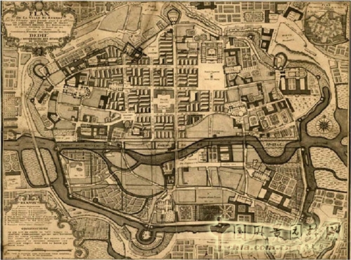 雷恩市在巴黎的西北邊,屬于布列塔尼區。上圖是雷恩早期的地圖,歐洲城市在早期一般都有城防,就是用防御工事包圍起來,中間有一條河穿過。