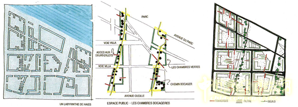 如上圖,我們的設計師是依據這片區域本身的景觀機理,也就是剛剛提到田園風光式的小樹林、綠林綠地等這些東西來進行規劃的。左邊這張圖就是城市的網格,是架在保留現有的這種帶狀小樹林的基礎上進行的,形成一個個方格狀的城市組團。每個建筑組團周圍都設計了很多的植物,大部分是用一種叫做千斤榆的植物來組成的,以此來協調景觀。整個趨勢就像俄羅斯的套娃,一個套一個,植物套建筑,建筑套植物,這些自然元素、自然景觀在新城的建設中就被保留下來了。