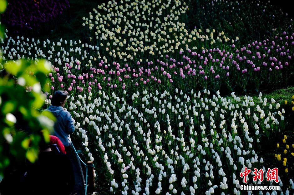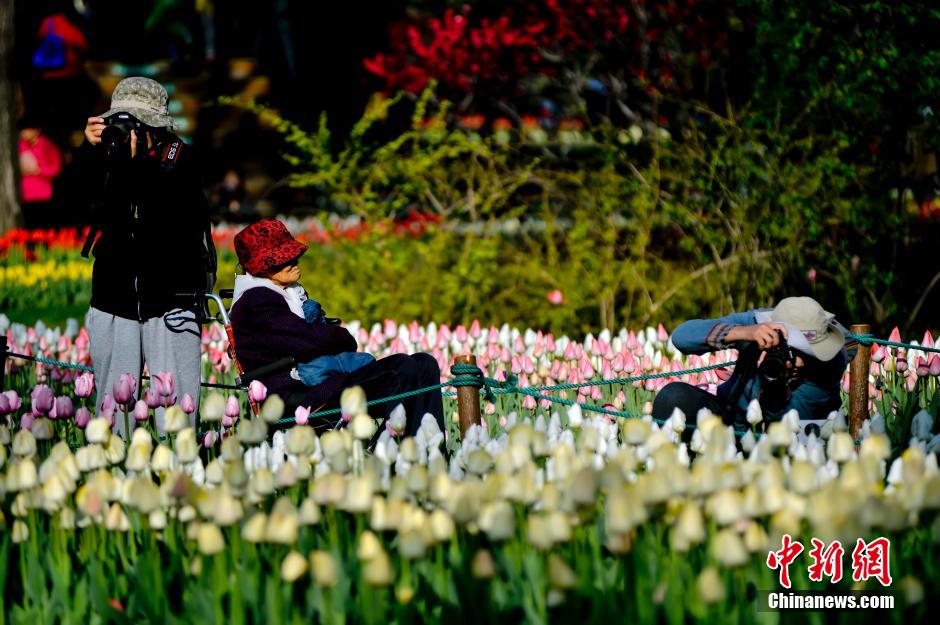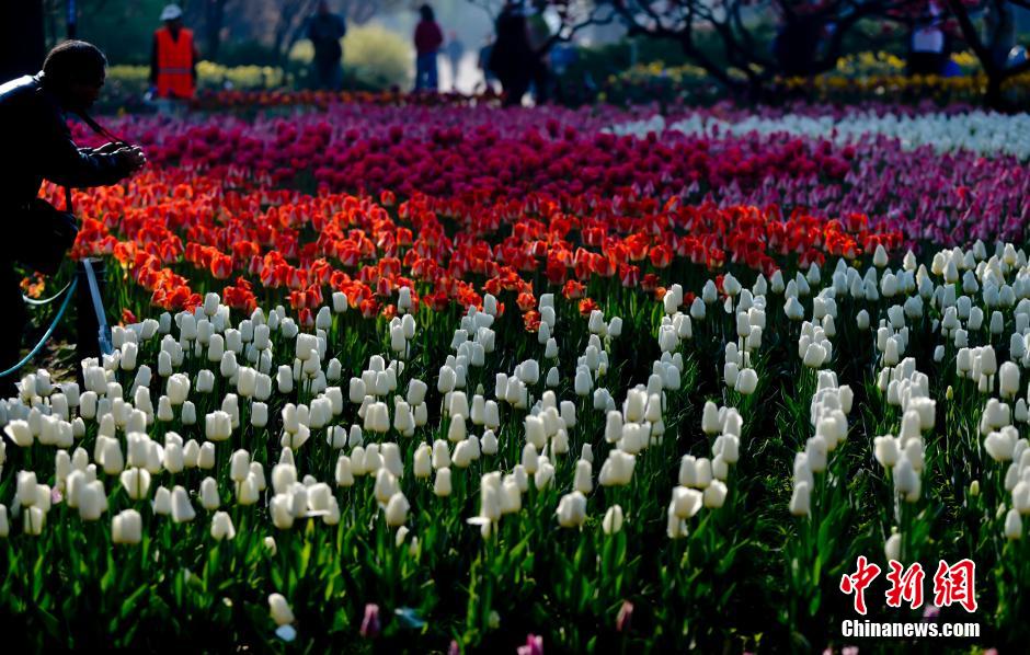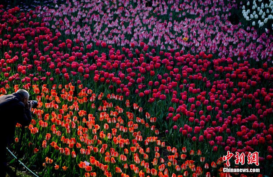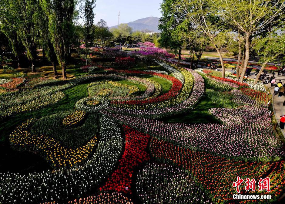 4月20日,北京植物園郁金香已經進入最佳觀賞期,近萬平米的郁金香花海展區內,105個品種的50萬郁金香競相開放,猶如花的海洋。俯瞰花海,中心區域是一個蝴蝶結徜徉在花海中的美麗圖案,花海西側則是由彩帶串聯起的兩個小蝴蝶圖案,這是北京植物園的園藝師們在種植郁金香時設計好的圖案。