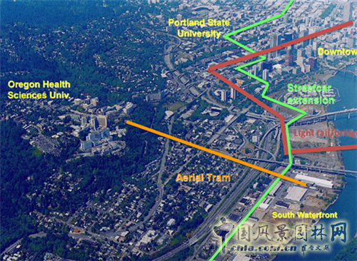 在濱水區(qū)改造過程中,我們做了很多方案,目前因?yàn)橘Y金的問題實(shí)施的非常緩慢,但是在一些很重要的節(jié)點(diǎn)規(guī)劃上,除了汽車的交通工具以外,大量利用纜車、高空纜車,來連接山里的大學(xué)和山下輕軌中轉(zhuǎn)站的交通,減少對山體交通的壓力。