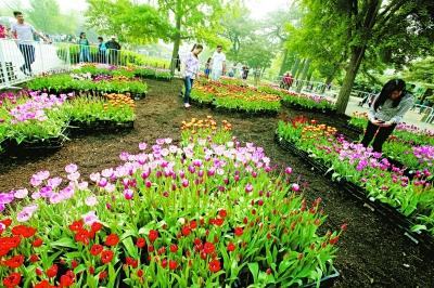 昨天,由五種顏色萬余株郁金香組成的百米花毯在北京植物園展出,這是國內(nèi)首例郁金香花毯。