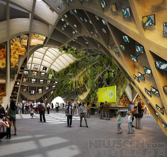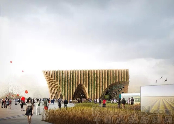 占地3600平方米,2015米蘭世博會法國館延續了“大市場”的主題,整個建筑是一座向城市開敞的大廳。建筑由取自侏羅山脈的木材建成,共三層樓高,并在天花板上掛滿法國典型的農副產品。建筑以“上下顛倒”的方式重現了由法國市郊農民所塑造的土地景觀,并形成館區的頂棚。巨大的屋頂和陰影為炎炎夏日帶來了涼爽的氣息。 法國館試圖重新詮釋市場的模式:食物的生產和消費都在同一個地方。隨著工業社會的發展和運輸的便利提升,食物運輸再也不是難題。但事實上,我們并不需要一個西紅柿穿越200公里才來到我們的餐桌上,如果能夠實現在當地市集中即產即消,這將無疑將有助于減少人類因食物運輸而產生的碳排放。而法國館的設計方案將有助于推動這一方面的探索。展館的立面和屋頂種植有啤酒花和香草,用于生產,而露臺設置有餐廳,用于消費。這是一個“具有孕育能力的市場”的圖像,也是一個直接的生產和消費系統。在世博結束時,還會有收獲啤酒花的大型活動。