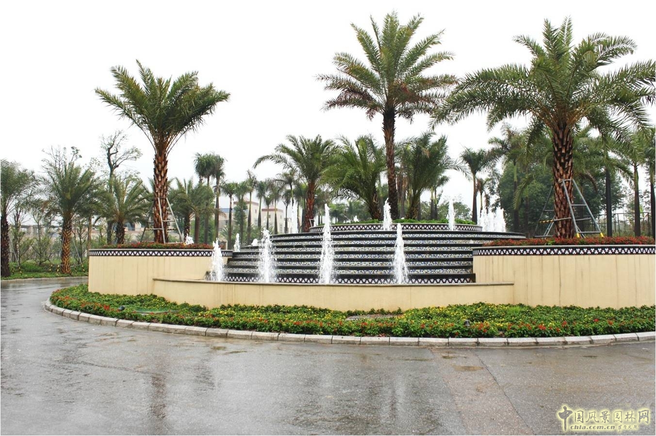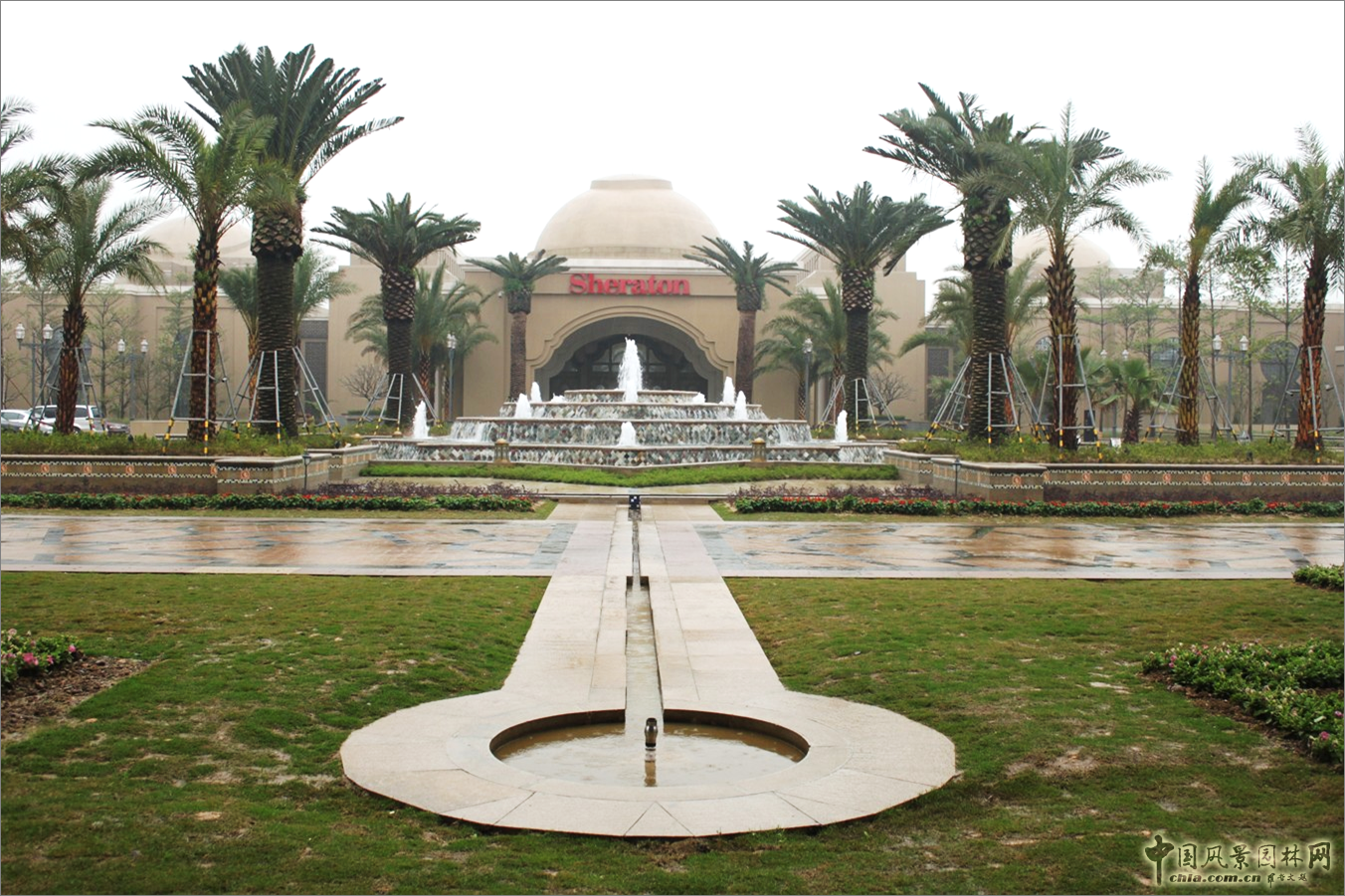 在施工中,深圳華美綠針對該項目的異域風情和五星級酒店高規格的特點,對細節精雕細刻,融合中西文化和古今園林的手法,結合阿拉伯風情建筑的特點,引入自然生態配置與健康環保植物的理念,根據植物不同的生物學特性,按照其自然生態群落的生長特點,將棕櫚、喬、灌、草、攀援植物、水生植物等合理配置在一起,充分發揮植物的多樣性,形成了豐富多彩的園林藝術美,在視覺上,既有濃郁的異域風情又有回歸自然的感覺,列植的棕櫚科植物大氣威武,而其它高矮植物配置錯落有致,與特色的建筑物相得益彰,而游泳池、噴泉等特色水景的應用,使該酒店成為一個天人合一而又充滿濃郁阿拉伯風情的景觀,盡顯清遠獅子湖酒店的異域、尊貴、典雅的氣質。