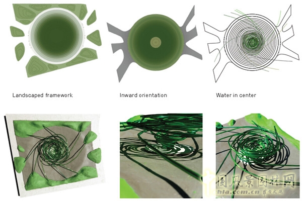 左:景觀框架 中:向內的景觀 右:中央的水渦 (平面圖及效果圖)
