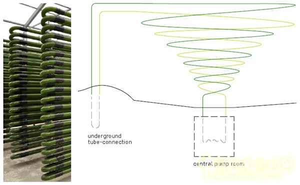 管道中的水藻營養液隨著壓縮空氣的流入而不斷流動著,保證了管道中物質的最優平衡,同時也避免了藻類顆粒附著在管壁上。整個循環系統的運作起始于花園中央埋于地下的泵房,將泵房埋于深處可實現對管道中液壓梯度的充分利用。