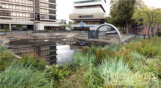 廣場附近和屋頂的水都會被收集到盆地中,在廣場中間行成三個小湖。城市的運河系統有足夠的容量允許水的流入,盆地內的水慢慢的消失,再一次將活動空間騰出。同時,水廣場的概念還改善了城市開放水環境的質量,防止不干凈的水直接流入運河中。