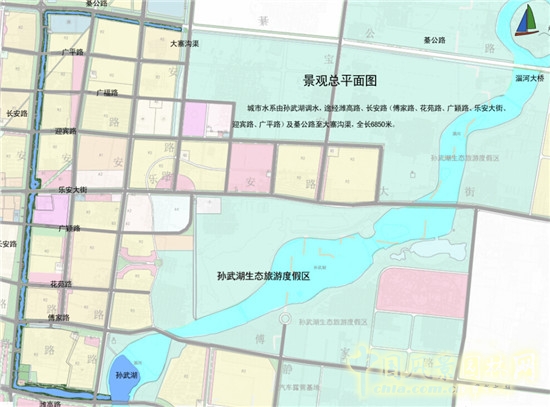 廣饒縣城市生態水系由孫武湖調水,途徑濰高路、長安路及綦公路至大寨溝渠,全場6850米,總規劃面積約36萬平方米。