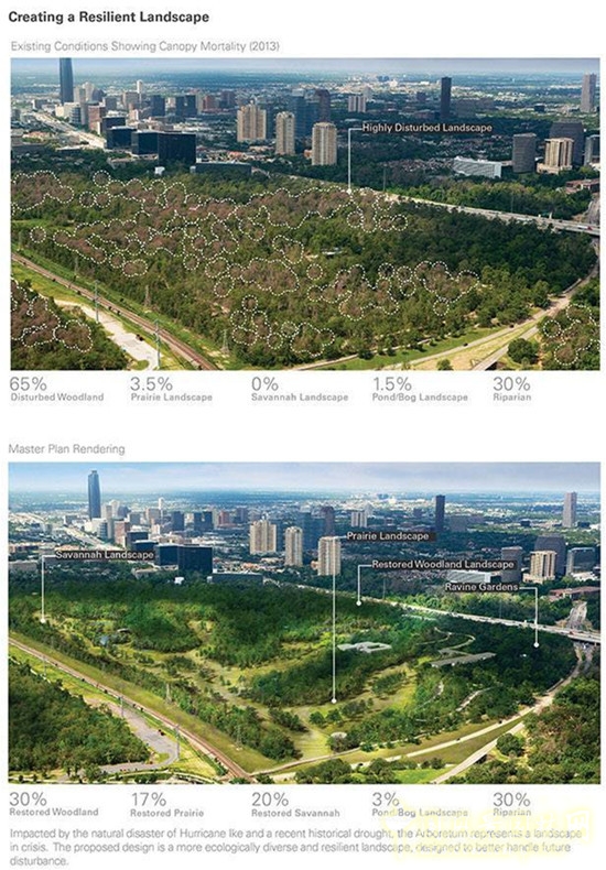 在經歷了颶風艾克和百年難遇的干旱等自然災害之后,植物園的景觀面臨著嚴重的危機。該規(guī)劃提案旨在提高景觀的生態(tài)多樣性和可塑性,使其能抵御未來可能的災害。