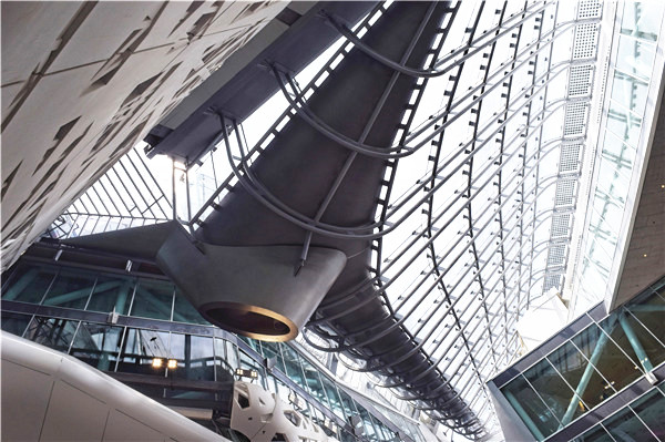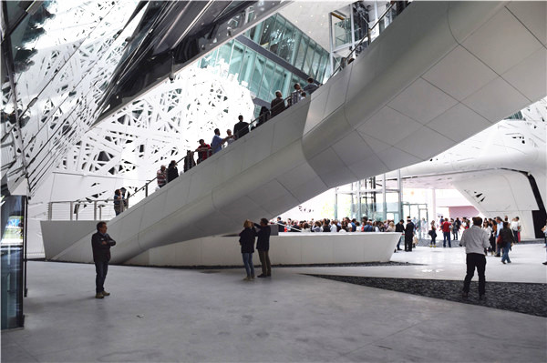 Nemesi為意大利館設(shè)計(jì)的創(chuàng)新“船帆”屋頂,由Stahlbau Pichler完成。光伏玻璃、平面和彎曲的幾何造型構(gòu)成了森林樹冠層的詮釋。屋頂?shù)竭_(dá)內(nèi)部廣場的上方,巨大的圓錐形玻璃窗“掛”在廣場上面,散發(fā)出自然的光亮。
