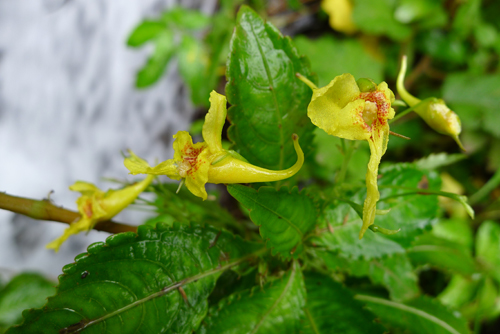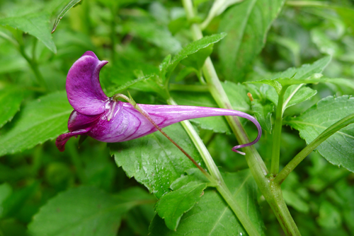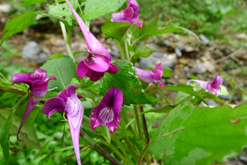該種花卉草本、簇生,植株高約30厘米,花莖脆嫩,葉片呈鋸齒狀對生,夏日開花,有紫紅、黃、白三種,花朵一端有根卷須,花身上有不規(guī)則的花紋,柔嫩細(xì)長的花柄仿佛一根絲線似的穿插在綠葉下面。此花被當(dāng)?shù)卮迕駛兎Q為“水網(wǎng)花”,但一番咨詢得知,她的學(xué)名是“龍蝦花”。