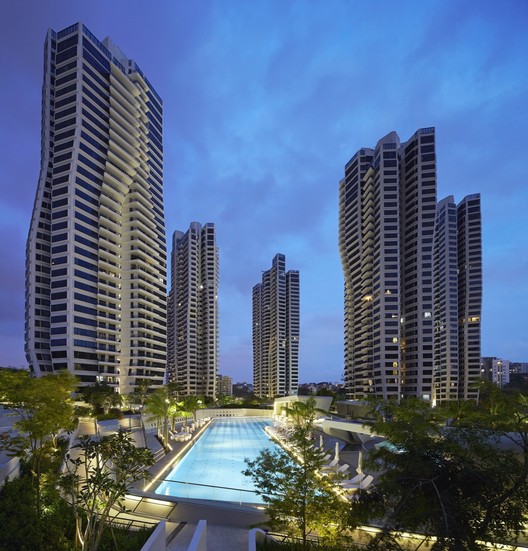 公寓有70%的綠色植被覆蓋,其中還包括彎曲的踏步和高聳的景觀形式。階梯狀的景觀平臺最大限度的擴大了公共空間的面積,其中除了spa、體育館和水池之外,還包括一系列圍繞氣味、運動、迷宮、象棋、雕塑和懸掛植物為主題的花園。這些優美的綠色景觀還一直延伸到建筑內部,特殊設計的開窗讓居住者能觀賞到武吉知馬自然保護區和植物園的景色。