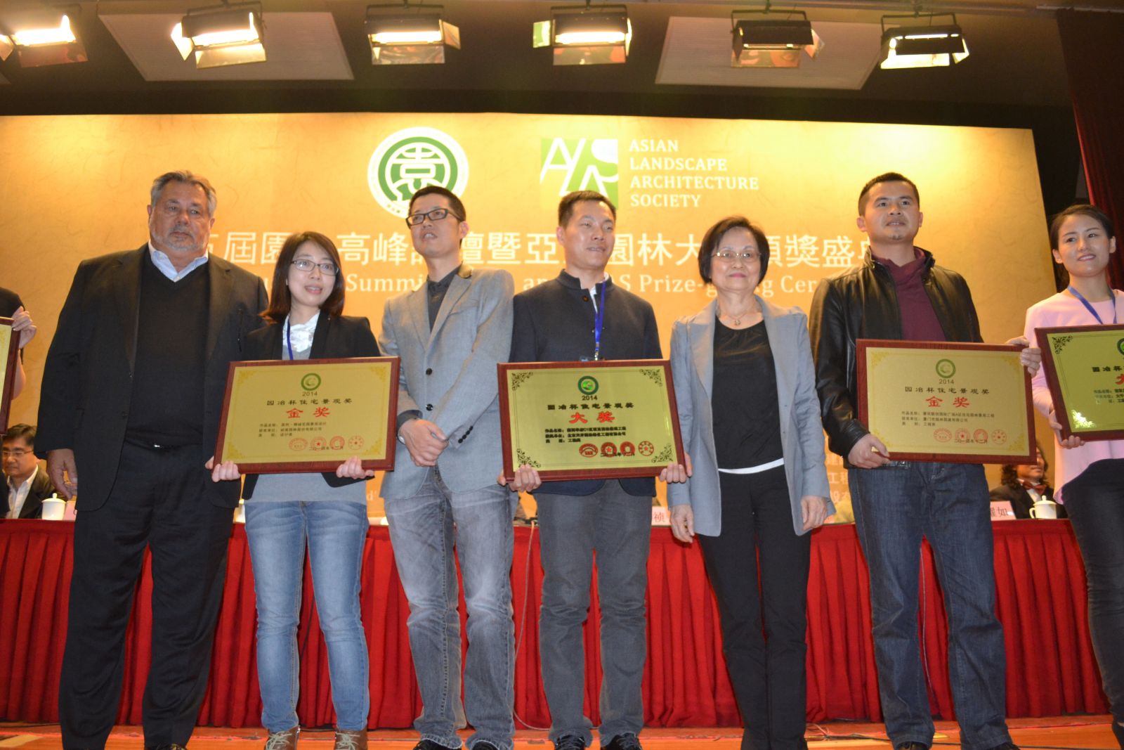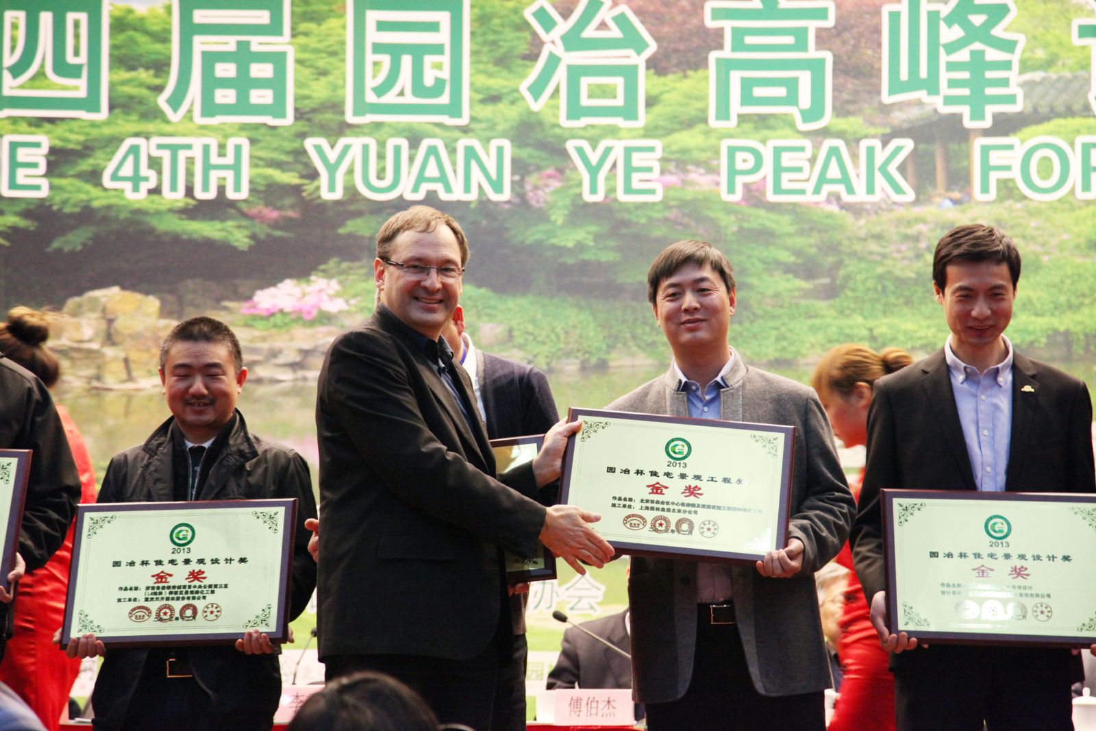 國際著名景觀設計師道格拉斯·庫曼(左1)、亞洲園林協會主席王小璘(右3)為獲獎企業頒獎