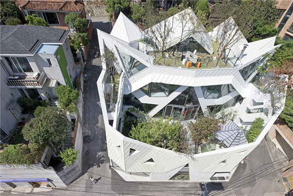 “Hwa Hun”在韓語中是一座房屋的名字,而這所房屋蘊意為“綻放的房屋”。業主的最大要求是“回歸大自然”。位于首爾城中心“北漢山”附近的建筑原有場地呈地形陡峭的不規則多面體形狀。建筑師積極應對場所,不僅最大化了土地利用率,還與場址的自然條件相互調和。
