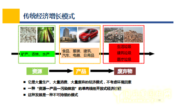 這種工業發展的模式可以概括為傳統的線性發展模式,資源采掘——形成產品——消費——廢棄物——填埋處理,這種模式運行中以大量的使用化石燃料、機動車,城市蔓延式擴張、追求大而舒適為目的。它是一種大量生產、大量消費、大量廢棄的經濟模式,使人類的生活從搖籃走向了墳墓。